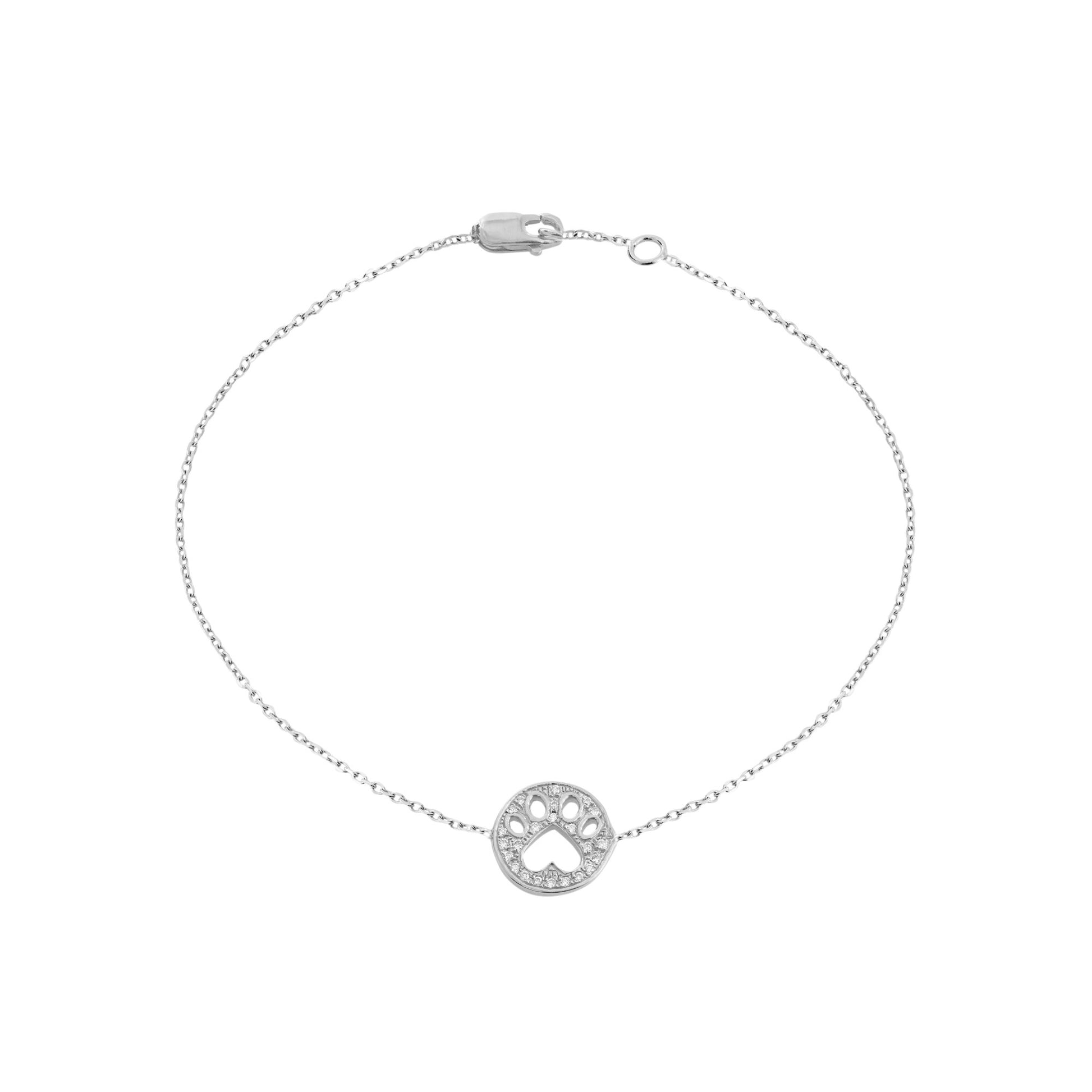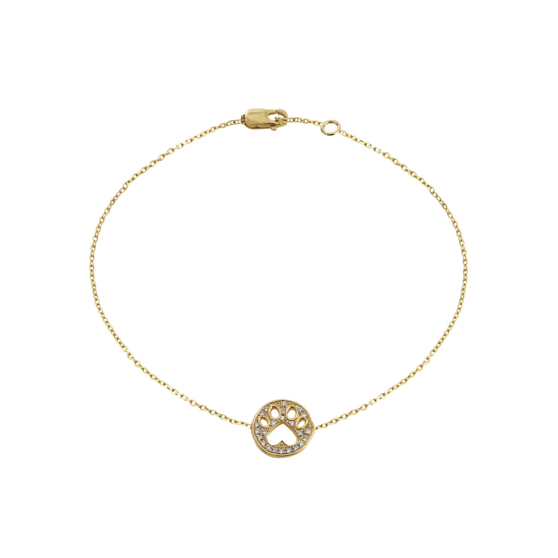 Our Cause for Paws 14k gold and diamond mini paw bracelet. 14k gold bracelet with a pave diamond paw charm. Total diamond weight 0.08cts. Available in 14k yellow, white or rose gold.