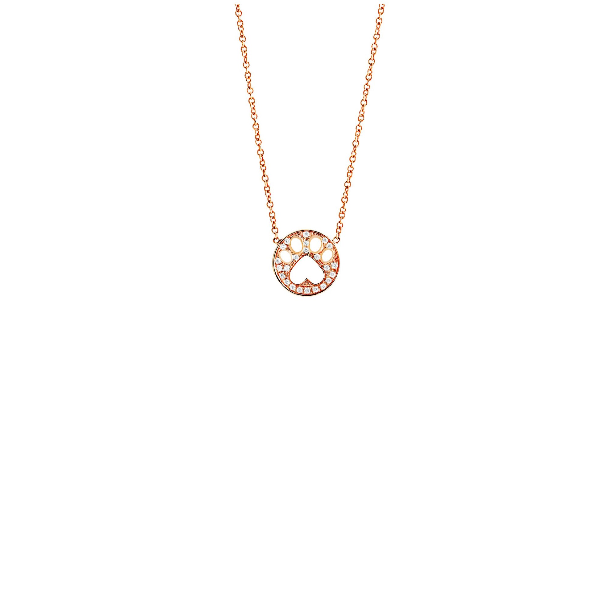 Our Cause for Paws 14k gold and diamond mini paw pendant necklace. 14k gold necklace with a pave diamond mini paw pendant. Total diamond weight 0.08cts. Necklace measures 17" long. Available in 14k yellow, white or rose gold.